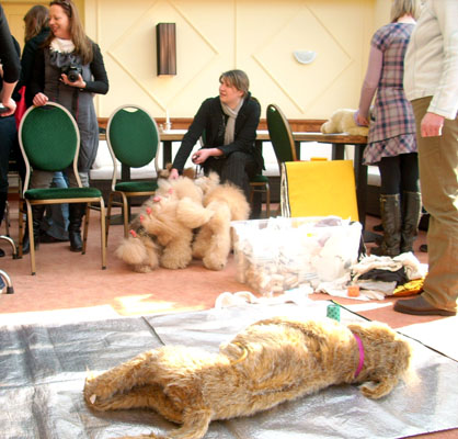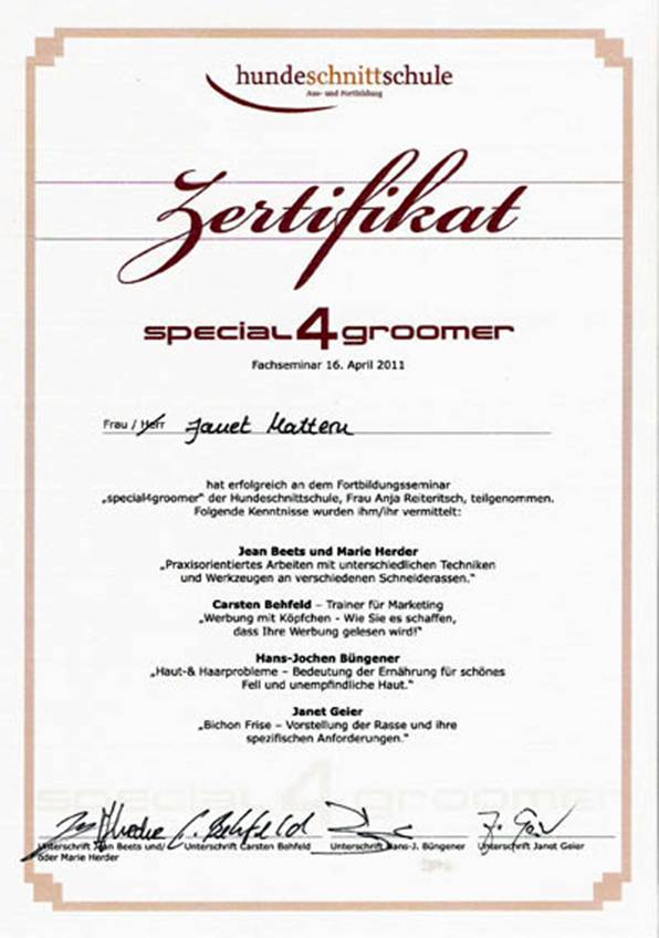 Trittau (16.04.2011) Ich war nach Trittau (bei Hamburg) zur Fortbildung von „Special 4 Groomer“ gefahren. Es gab 2 Schneidevorführungen. Zum einen wurden Langhaar-Rassen wie z.B. Shih Tzu, Lhasa Apso, Bolonka usw. gezeigt, die mit unterschiedlichen Techniken und unterschiedlichen Werkzeugen bearbeitet wurden, um Vor– und Nachteile der verschiedenen Schnitt- Ergebnisse aufzuzeigen. Zum anderen sahen wir den Bichon Frisé. Darüber hinaus sahen wir noch 2 Vorträge von Themen, die den Beruf des Hundefriseur nur indirekt berühren: Marketing und Haut- & Haarprobleme. |