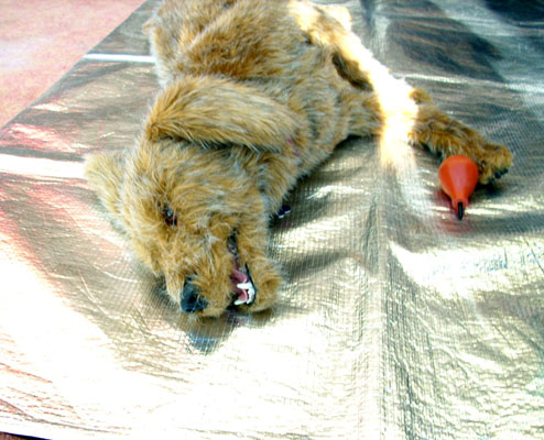 Das ist ein Hunde– Dummy, an dem man beatmen und Herz– Druck– Massage üben kann! |