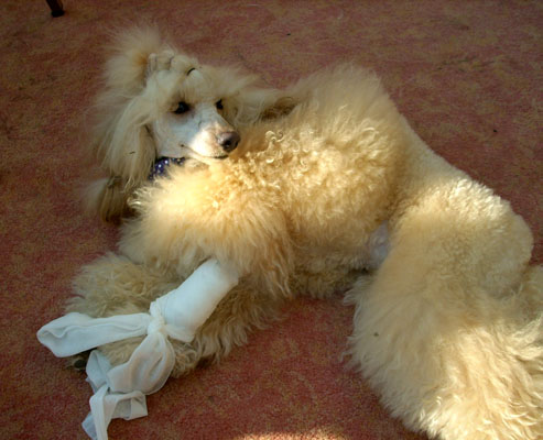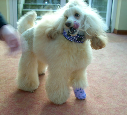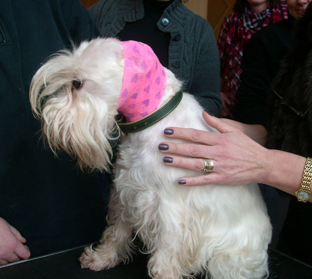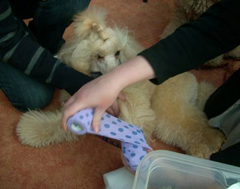 Und hier bekam Lilli einen Pfotenverband, selbstverständlich farblich abgestimmt zum Halsband! |