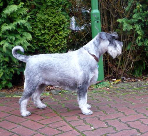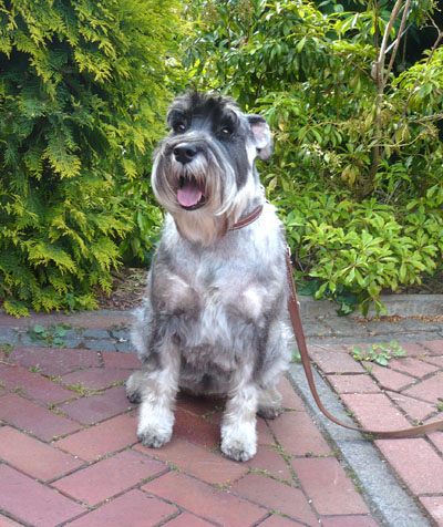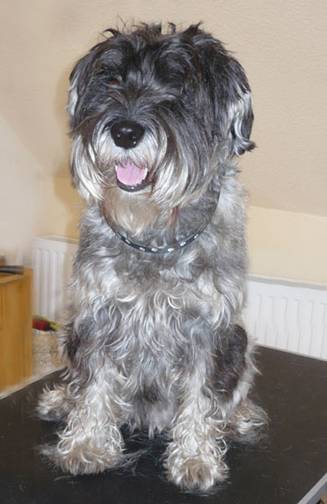Mittelschnauzer Hündin Makiba kommt zum Trimmen. Das Haar wurde von mir aufwändig restauriert, doch der Aufwand hat sich gelohnt! |