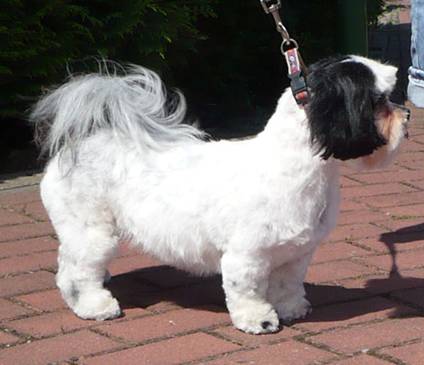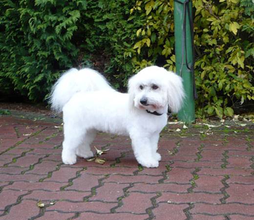 Coton de Tuléar Rüde Henri wurde auf Wunsch der Besitzer halblang von Hand geschnitten. |