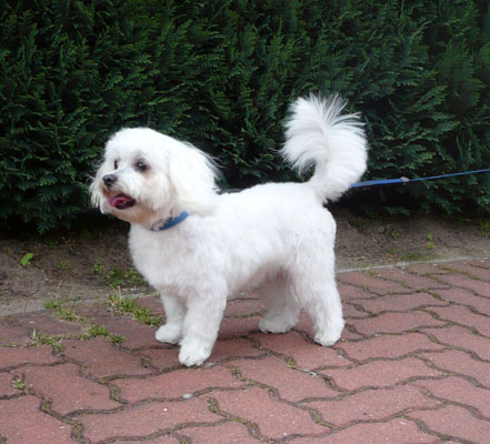Malteser Rüde Tapsi sollte einen „Sommerschnitt“ bekommen, der aber nicht zu kurz sein sollte. Die Rute sollte etwas länger bleiben und die Augen sollten schön frei geschnitten werden. |